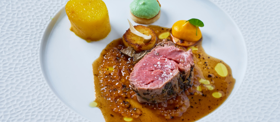 Hovězí svíčková, topinambur, černý kořen, lanýžový kaviár, brambory
